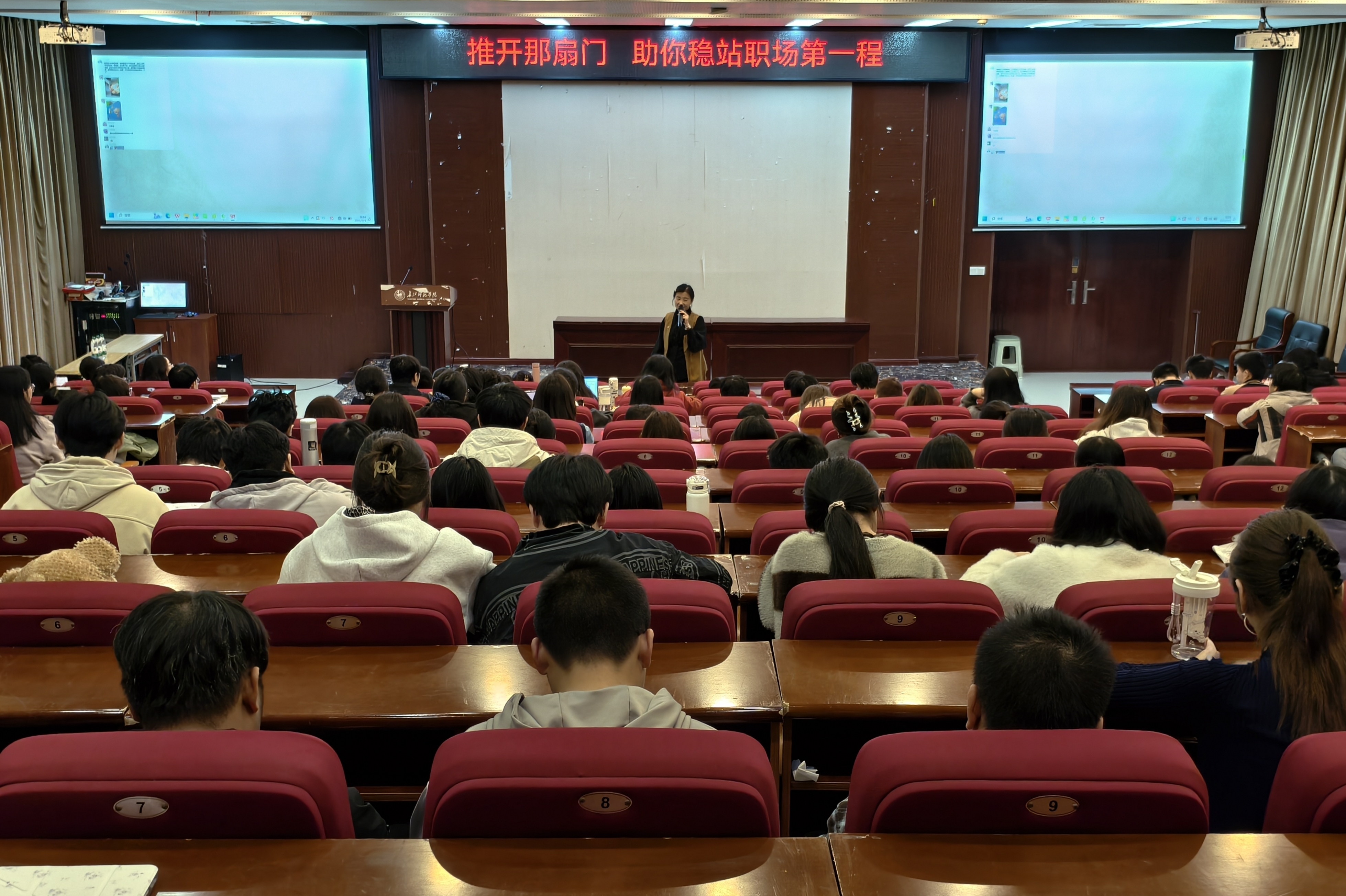 11月3日下午,数学与统计学院在崇仁楼玉衡学术报告厅开展23级数应“新课程推开那扇门,助你稳站职场第一程”主题报告。沙坪坝区新桥小学朱莉老师和南开小学杨靓菡老师担任主讲人,2023级数应全体学生参加。