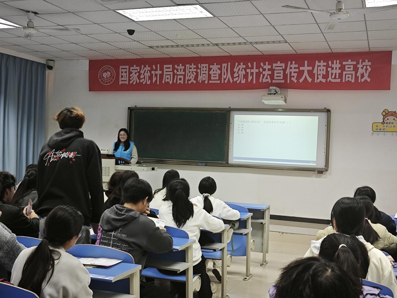 国家统计局涪陵调查队宣传大使张玉洁为师生带来专题宣讲,围绕新修改《统计法》的核心内容展开深度解读,重点阐释了《统计法》修改的重要意义和主要内容,详解依法统计的重要性和必要性,结合生动案例传递“真实是统计的生命”的核心理念,帮助师生深化对统计法治的认知,强化维护数据真实性的责任意识。活动现场设置宣传手册、有奖知识问答等互动环节,以趣味形式助力同学们巩固统计法治知识。