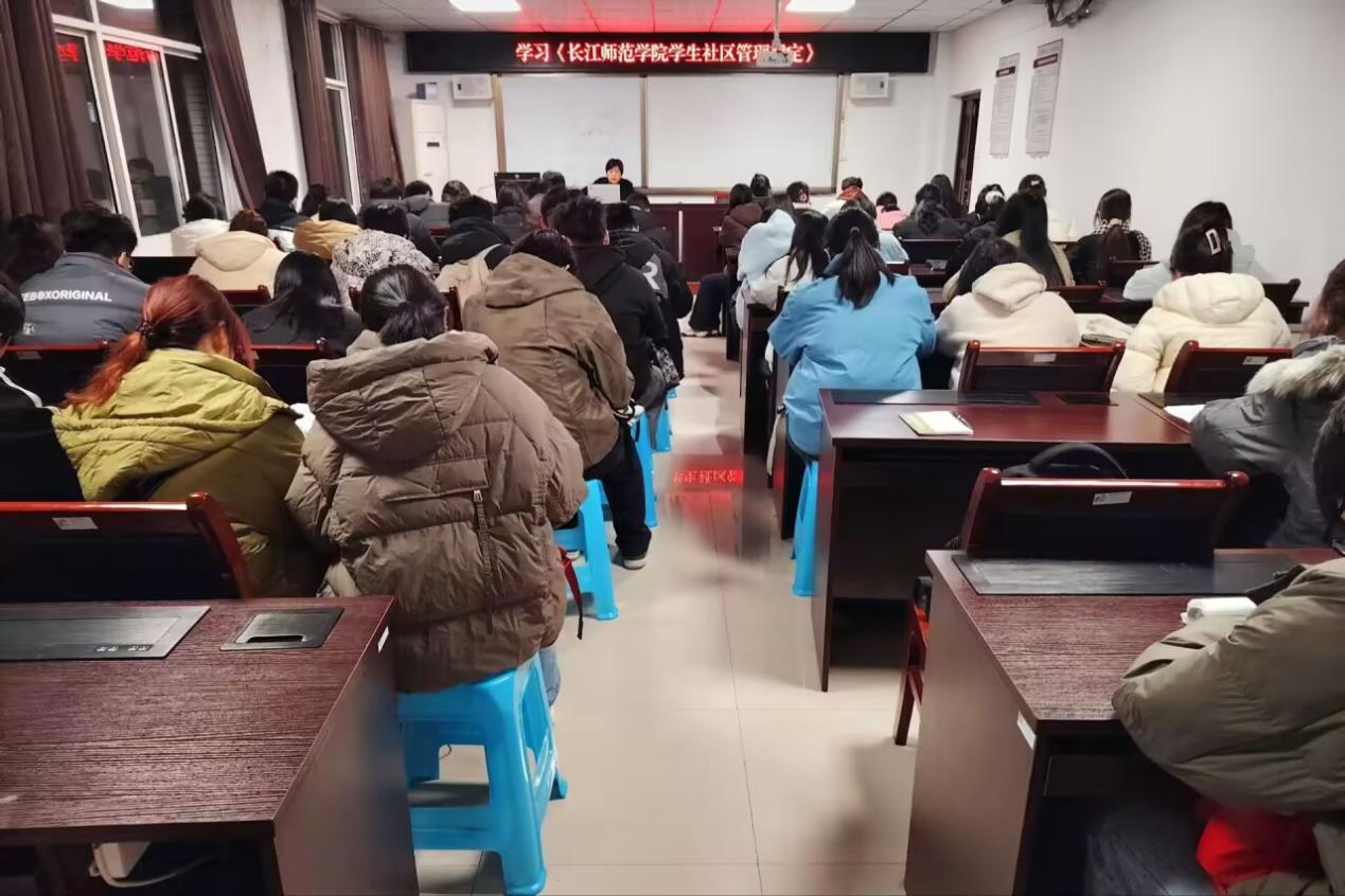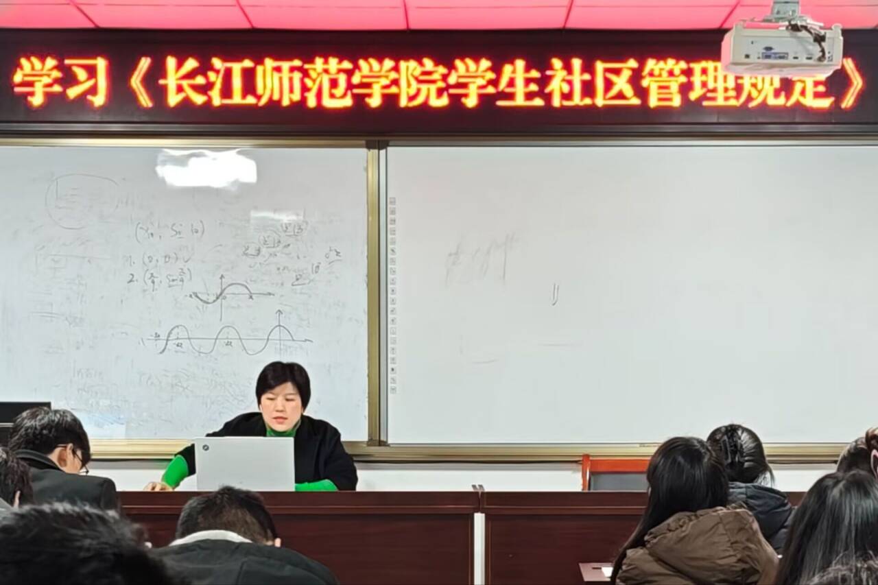 12月11日晚,数学与统计学院在钩深楼附楼206会议室组织学习《长江师范学院学生社区管理规定》。我院学工办主任姜丽担任主讲人,我院全体学生干部参加。