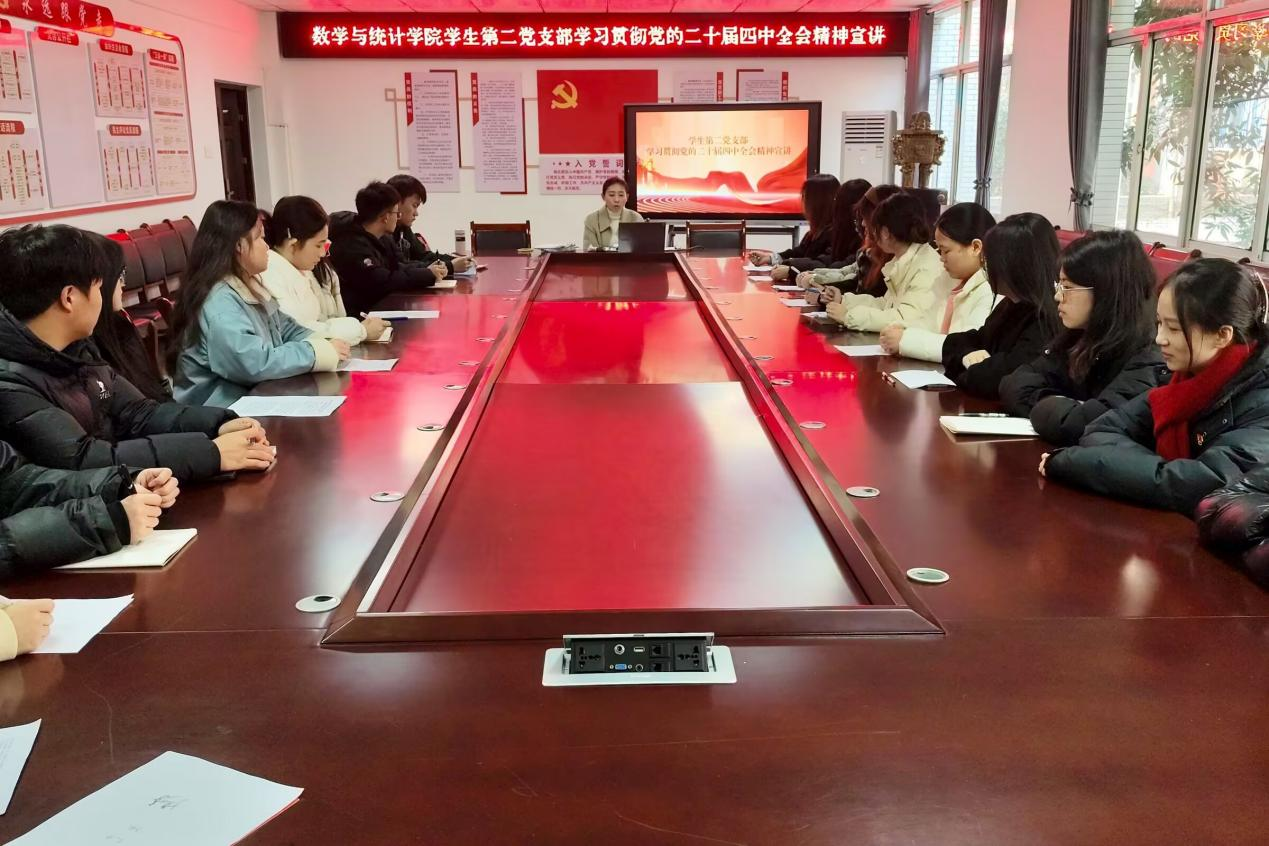 12月18日中午,数学与统计学院在钩深楼附楼216会议室开展学生第二党支部学习贯彻党的二十届四中全会精神宣讲。我院学生第二党支部书记担任主讲人,支部全体党员参加。