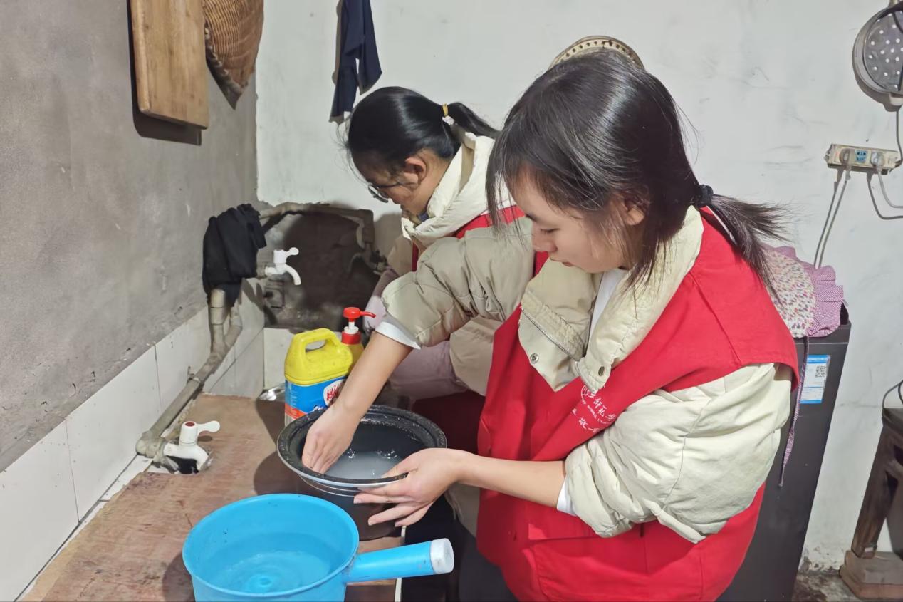 活动现场,志愿者们分工协作,有的与残障老人一同捆绑整理柴火,将散落的枝干捆扎紧实、归置整齐;有的走进厨房,手持炊具仔细清洗碗筷、反复擦拭台面,把满是油污的厨具和灶台清理得干干净净;还有的帮忙擦拭门窗、整理屋内杂物,将零散的生活用品分类摆放。从庭院的柴火归置到屋内的卫生清洁,志愿者们不放过每一个角落,各尽所能,为残障老人的生活空间带去整洁与温暖,用双手让居所变得井井有条、焕然一新。