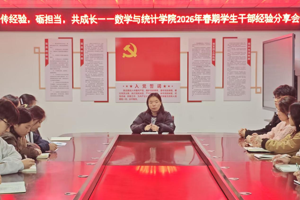 3月5日下午,数学与统计学院在钩深楼附楼216会议室组织开展“传经验,砺担当,共成长”2026年春期学生干部经验分享会。我院22级学生黄圆媛担任主讲人,我院全体学生干部参加此次会议。